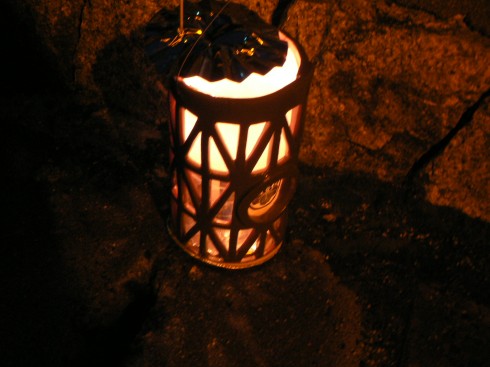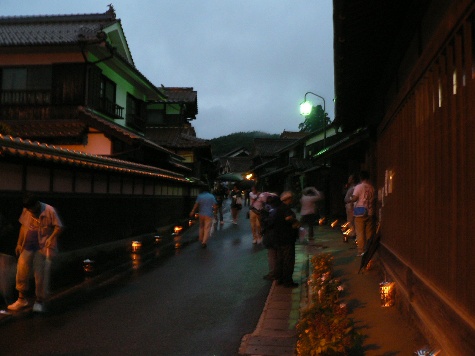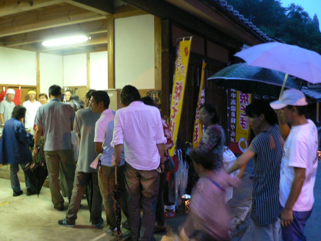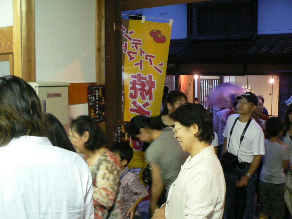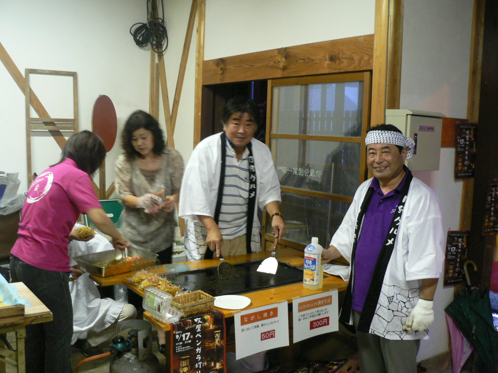 おかやま県民文化祭・地域フェスティバル「文化がまちに出るプロジェクトin高梁」のオープニングイベントとして、吹屋ふるさと村・町並み保存地区で、9月17日(土)に「吹屋ベンガラ灯り」が開催されました。あいにくの雨模様でしたが、午後5時30分から開会式が行われ、主催者の中野・吹屋青年団加藤会長(成羽観光協会吹屋支部長)の挨拶の後、近藤高梁市長、岡山県備中県民局臼井局長ら来賓の皆様が挨拶を行われました。そして、灯ろうに点火され、歴史的町並みの中に灯ろうが灯され幻想的な雰囲気になりました。このイベントには備中高梁食援隊も参加し、備中高梁B級グルメインディアントマト焼そばを出店し300円で販売いたしました。午後5時30分から販売を開始、行列ができる中約2時間で完売いたしました。
